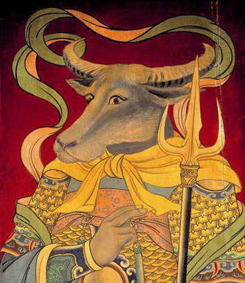 "牛鬼蛇神"这一俗语来源于佛教用语。"牛鬼"和"蛇神"分属不同的两种类别。顾名思义,"牛鬼"属于鬼的系统,"蛇神"属于神的系统。"牛鬼"是地狱中的牛头鬼卒,名叫阿旁,称为"牛头阿旁",据《五苦章句经》载:"狱卒名阿旁,牛头人手,两脚牛蹄,力壮排山。"《法苑珠林》引《罪业报应教化地狱经》:"牛头阿旁,以三股铁叉,叉人内著镬汤中,煮之令烂。"可见,牛头阿旁的特点是力大如牛,与好搭档马面罗刹并称"牛头马面",任务是负责惩罚那些堕入地狱的坏人,可以说是地狱的头号狱卒,首席执行官,CEO哦。