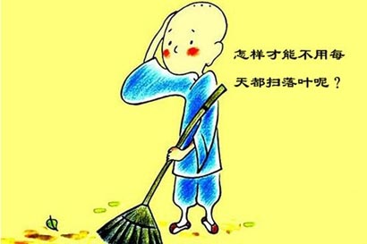 从前,有个小和尚,每天早起,负责清扫寺院里的落叶。的确,清晨起床扫落叶实在是一件苦差事,尤其是在深秋,冬天就要来临的时侯,每天一次起风,满院子的大树随风摇摆,树叶随风飞舞落下,满地都是,厚厚的一层。要清扫完这些叶子,每天早上都需要花费很长时间才能完成。而且,过不了半天,树叶有飘落满地。这让小和尚头疼不已,他冥思苦想,一直想要找个好办法让自己轻松。