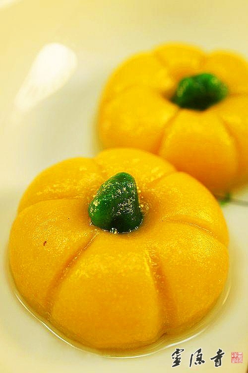 11最后用绿色菠菜汁混合的面团搓成小圆柱,沾些水按在顶部的小坑里,做南瓜蒂。