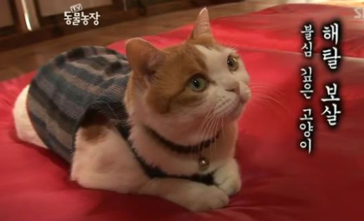 韩国庆尚北道尚州市有一寺院叫做"龙兴寺"。寺内有"一位"不平凡的猫咪"信徒"。这只"法号"叫"解脱"的猫咪不吃荤、不杀生,而且不管严寒酷暑、冬夏春秋,一天不落的在佛堂前"虔诚"拜佛。