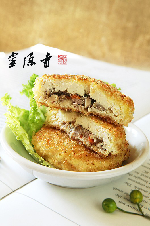 豆腐200g,素肉馅40g,香菇两朵,胡萝卜末少许,姜末少许,面包屑20g,酱油,盐,糖,香油。