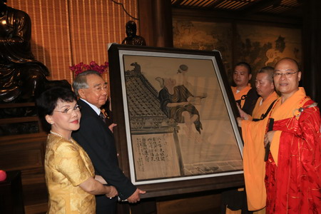 光泉法师代表灵隐寺赠送张荣发居士济公画