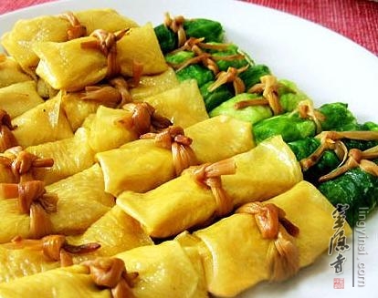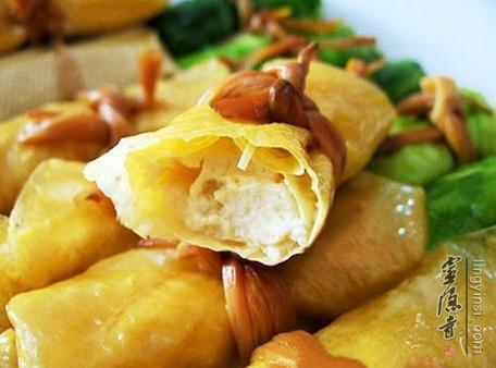 【材料】:豆腐,油豆皮,水发黄花菜,青椒,胡萝卜。