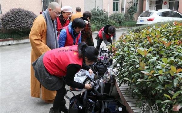 2014年12月15日,在灵隐寺“寒冬送温暖”活动中,灵隐寺慈善功德会的恒诵、镇法、宏明等法师,带领着云林志工团的志工们,为袁浦敬老院、周浦敬老院、转塘敬老院的老人们送去了厚厚的棉衣、棉裤、毛袜和灵隐寺方丈光泉大和尚亲笔题字的2015新年挂历,送上灵隐寺的新年问候和吉祥祝福。所到之处,受到了敬老院老人们的感恩和欢迎。严冬的寒冷里,跳动的是一颗颗火热的慈悲之心。