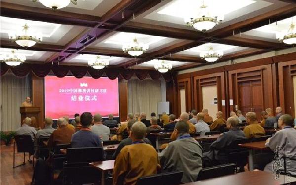 2019年4月10日下午,由中国佛教协会主办、杭州市佛教协会协办,中国佛教讲经交流基地和杭州灵隐寺共同承办的"2019中国佛教讲经法师研习班"在杭州灵隐寺圆满结业。40余位学员喜获结业证书。参加此次研习班的学员均为历届全国佛教讲经获奖法师。结业仪式现场 中国佛教协会副会长静波法师,中国佛教协会副秘书长、中国佛教讲经交流基地主任、杭州市佛教协会会长、灵隐寺方丈光泉法师,中国佛教协会教务部主任、中国佛教讲经交流基地副主任长顺法师,浙江省民宗委宗教一处副处长楼跃文,杭州市民宗局党组副书记、副局长唐明壮等出席了结业仪式。出席结业仪式的嘉宾和领导在前排就座&n
