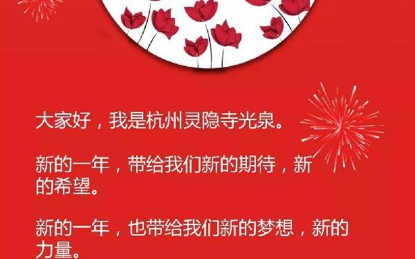 2019年1月1日零时零分,浙江省佛教协会副会长、杭州市佛教协会会长、灵隐寺方丈光泉大和尚和杭州市市长徐立毅等领导及社会各界人士,在千年古刹净慈寺一起敲响新年钟声,祈愿祖国繁荣昌盛,人民幸福安康。光泉大和尚和杭州市市长徐立毅敲响新年钟声 "闻钟声,烦恼清;智慧长,菩提增"。南屏晚钟,洪音嘹亮。钟声即佛法。元旦叩钟旨在祈祷国泰民安,万家欢乐、五谷丰登、吉祥如意。 "敲钟祈福"是中华民族辞旧迎新、祈福吉祥平安的传统文化活动。新年钟声穿透了一切,将美好的祝福,送到了每一个人的心中。 每年的新旧交替之际,很多人会从远地赶到杭州灵隐寺