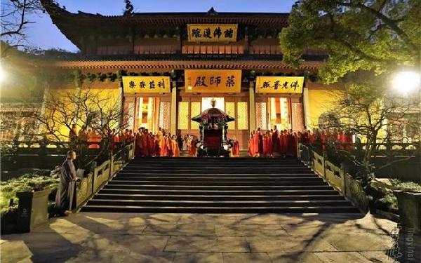 药师殿内外 灯火辉煌 光耀三界 2018年12月24日(戊戌农历十一月十八)傍晚五时至次日零时,杭州灵隐寺在药师殿举行冬至"佛七"祈福法会之五大士瑜伽焰口佛事。僧众带众斋主同祈世界和平,风调雨顺,国泰民安;祈愿现生者消灾延寿,过世者往生净土;超度荐拔十方法界一切孤魂亡灵,悉获解脱法食,离苦得安、早登佛国。 众僧及斋主依次前往面燃大士坛等各坛上香礼拜。五大金刚上师登坛演法 五大金刚上师登坛上座、头戴毗卢帽、诵《瑜伽焰口》经,法音绕梁,佛铃净心,说法施食。 金刚上师手结密印、口诵真言、意存观想,说法施食,加持坛场内种种饮食。以清净甘露法味施予恶鬼道众生,令其得蒙佛力