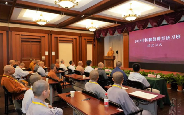 由中国佛教协会主办,杭州市佛教协会协办,中国佛教讲经交流基地和杭州灵隐寺承办的"2018中国佛教讲经研习班"9月14日上午,在杭州灵隐寺圆满结业。 中国佛教协会副会长静波法师、中国佛教协会秘书长刘威、中国佛教协会副秘书长、中国佛教讲经交流基地主任、杭州市佛教协会会长、灵隐寺方丈光泉法师在结业仪式上讲话。 杭州市民宗局党组副书记、副局长唐明壮,宗教处处长胡胜军和杭州市佛教协会秘书长钱俭忠,杭州灵隐寺监院觉恒法师、智光法师等出席结业仪式。 中国佛教协会副会长静波法师、中国佛教协会秘书长刘威为"2018中国佛教讲经研习班&rdqu