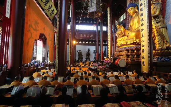 炉香乍爇 梵呗悠扬灵隐寺监院义广法师拈香主法《大方广佛华严经》有"经中之王"美誉法会现场 庄严殊胜法师率众延生安位海众云集 虔诚祈愿 2018年5月29日(农历四月十五),杭州灵隐寺启建安居共修华严法会,四众弟子齐聚药师殿恭颂《大方广佛华严经》,以此诵经功德祈愿世界和平,国泰民安,风调雨顺。 文殊菩萨、普贤菩萨与毗卢遮那佛合称"华严三圣"。毗卢遮那佛代表清净法身,文殊菩萨代表智慧信解,普贤菩萨代表行愿力行,表示通过信解行证而圆满佛果。 《华严经》共有三种翻译,现在流布较广的是唐朝实叉难陀尊者翻译的《华严经》,一共八十卷、三十九品,有四万五千