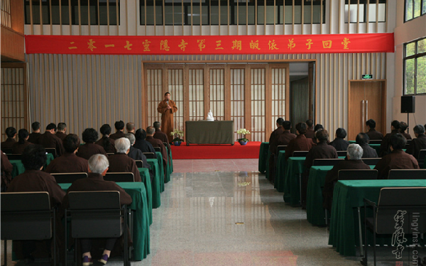 灵隐寺回堂学习活动迎请仪式迎请义广法师为大众授八关斋戒 2017年5月1日,放下外缘,精进修学。灵隐寺第二期皈依弟子回堂学习活动圆满,七十多位居士善信参加了本次回堂学习活动。觉恒法师发言勉励大众 监院觉恒法师勉励大众:"在回堂修学期间,按照寺院常住修习作息时间,放下外缘,精进用功,把心带回家。回家后,把身心的体验融入自己的家庭、工作中。发菩提心,自利利他,服务大众。"法师教授居士海青穿着步骤禅堂坐禅体验明慧法师为大众授课闻钟声烦恼轻 智慧长菩提增法师带领大众在寺院止语经行 学习期间,大众在法师的带领下通过穿着海青、上香礼佛等佛门礼仪的学习,以及暮鼓晨钟