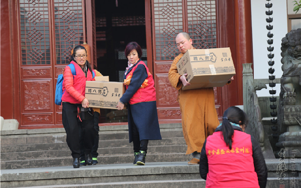 腊八奉粥是我寺持续多年的传统。12月31日,灵隐寺会面向社会团体、各界人士发放爱心腊八粥公益活动正式开始。从12月31日到1月5日日,灵隐寺将陆续向社会发放腊八粥,优先选择公益慈善机构、爱心福利机构以及老年人集中的社区进行派发。 早上,灵隐寺法师和爱心义工将凌晨煮好的第一批腊八粥装车出库,赶早送到敬老院、儿童福利院等慈善福利机构,分发到大众手中。同时带去吉祥的祝福与温暖关怀,叮嘱老人关注天气变化,注意保暖加衣,鼓励老人们坚持锻炼身体,以豁达开朗的心态快乐生活。 腊八粥送到交警执勤的街头,感恩他们不论严寒酷暑,风雨无
