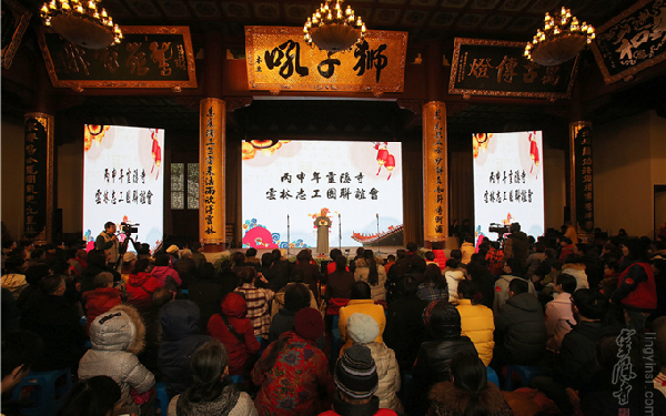 2017年1月15日,杭州灵隐寺法堂充满着温馨、吉祥的气氛,丙申年灵隐寺云林志工团联谊会在这里举行。云林志工团约500位义工菩萨从杭城的四面八方赶来,参加属于他们的盛会。 灵隐寺方丈光泉法师在百忙中抽出时间到会,对云林志工团义工们作了精彩的开示。 光泉法师开示说:佛教的传承靠三宝,三宝靠居士的护持,就像鱼儿离不开水。法师们要学习玄奘法师"远绍如来,近光遗法"的精神,努力精进,内修外弘;在家居士也要有次第地修学,积极弘法。这样才能学以致用,真正担当续佛慧命的责任,像千手千眼的观音菩萨救众生于苦难之中,并广度一切有情众生。 光泉