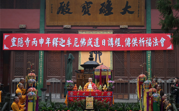 2017年1月5日(农历腊月初八),是我国一年一度的传统节日——腊八节。腊八是中华民族一个极其重要的节日,不但因为它是一个典型的具有民俗文化传统的节日,而且还因为它是一个源自佛教的节日。 农历腊月初八,又是释迦牟尼佛成道日,为缅怀佛陀苦行成道,灵隐寺常住依据丛林传统举行"丙申年释迦牟尼佛成道日讲经、传供祈福法会"。 上午8点30分,四众弟子迎请智光法师登坛说法,为大众开示佛教与腊八的历史文化渊源,进一步阐释了我寺多年来开展腊八系列活动的深远意义,号召大众诸恶莫作,众善