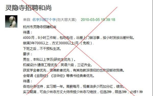 这是2010年出现的一则谣言 最近有微信说"杭州灵隐寺招聘和尚",开出的待遇很是吸引人: 待遇:8000/月,8小时工作制,包吃包住,出差上门做法事,按小时发放出差补贴。 做满3年14000以上,方丈30000以上/月 (免税) 上班期间,戒色禁烟酒。下班之后,不干预私生活。 其实,这种谣言已经不是第一次出现了,最早2006年就已在网络上出现,当时被谣传的"招聘单位"是成都大慈寺。9年来,韶关南华寺、杭州灵隐寺、甘肃白塔寺、上海静安寺、三亚南山寺等著名寺庙均相继传过类似谣言,内容几乎完全一致,只不过"月薪"一栏逐