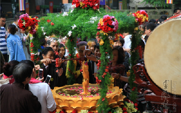 农历四月初八,是传统的佛诞日,相传释迦牟尼佛降生之时,有九龙吐清净水灌太子身,后世佛弟子因于此日作浴佛法会,以香汤灌注太子圣像,因此这一天又称为浴佛节。 5月25日,灵隐寺举行隆重庄严的浴佛法会,纪念伟大的人天导师释迦牟尼佛诞辰。一大早,方丈光泉大和尚率众将镏金太子圣像迎请至大雄宝殿,恭敬安放于早已精心装饰的九龙金盆之中。 一时间,经声佛号,梵唱清扬。四众弟子,合掌礼赞,感恩本师释迦牟尼佛慈航倒驾,降生此娑婆世界。苦海作明灯,照破千年暗夜;人天同欢喜,妙法普度群生。 光泉大和尚领众三勺,以五色鲜花成就的香汤浴灌释迦太子金身。随后,大众法师、信众居士依次举勺,九龙圣水,次第浴佛,共祈慈