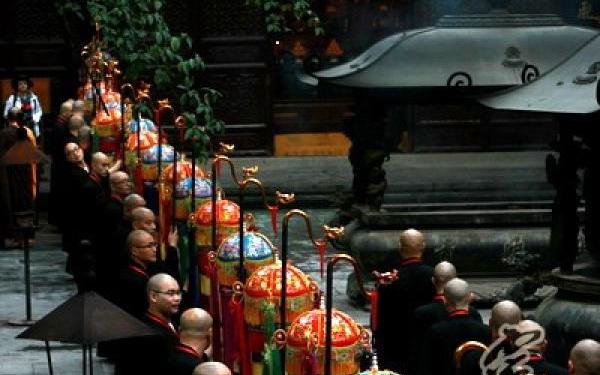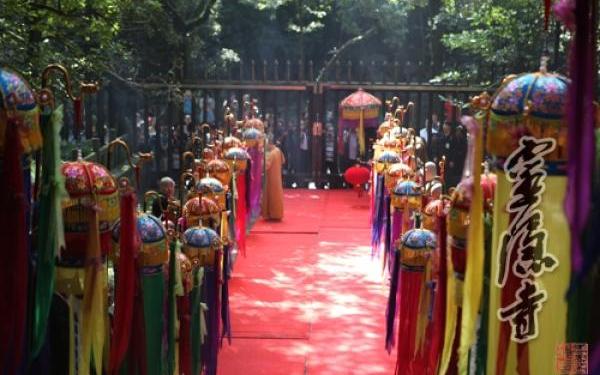 当日上午,在中佛协常务理事、浙江佛协副会长、杭州佛协会长、我寺方丈光泉大和尚和众引礼师的率领下,戒子们执持幡、香炉、灯、伞盖等一应庄严仪仗,列队排班,到山门前恭迎美国中华佛教会会长妙峰长老法驾。