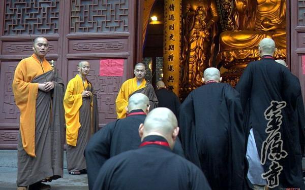 上午,灵隐寺药师殿前挂"正授"牌示,殿内供香花灯烛,气氛庄严隆重。新戒们排班恭候戒和尚光泉大和尚、羯磨阿阇黎怡藏大和尚、教授阿阇黎允观大和尚入坛。三师升法座后,新戒至诚顶礼三拜,长跪合掌。