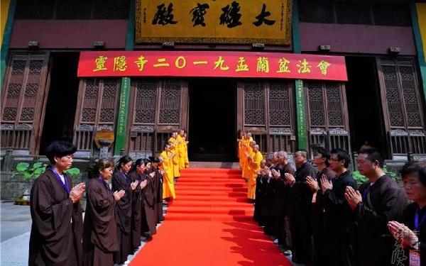 2019年8月15日(己亥农历七月十五日),为佛教的盂兰盆节,亦为佛欢喜日,僧自恣日,报父母恩日。值此龙天欢喜的良辰吉日,杭州灵隐寺举行多项佛事活动。凌晨四时三十 凌晨四时三十分,杭州灵隐寺常住法师谨遵佛制,在大雄宝殿举行庄严的安居解夏仪式。为期90天的结夏安居圆满结束。 早上七时 早上七时,杭州灵隐寺在药师殿前举行放生法会,大众共祈世界和平无兵戈,国泰民强人安康。上午八时三十 上午八时三十分,杭州灵隐寺在大雄宝殿隆重举行一年一度的"盂兰盆法会"。沿习成例,法会仪式分为三个阶段,即净坛诵经、上兰盆供、众僧受食。大众表达对诸佛菩萨和僧众的恭敬供养,以此功德回