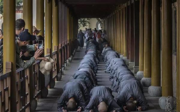 2019年7月8日(农历六月初六),杭州灵隐寺方丈光泉大和尚带领灵隐寺常住法师,三步一拜朝礼观世音菩萨道场普陀山。杭州云林志工团的志工和来自江苏、上海和杭州、宁波、台州、金华的善信居士自发参加了本次朝山活动。朝山活动如理如法,四众弟子威仪具足,沿途见闻者,无不欢喜赞叹,恭敬观礼。 山门出发的第一拜 光泉大和尚领众三步一拜朝觐观音菩萨道场 早上八点,朝山队伍在灵隐寺方丈光泉大和尚的带领下,从普陀山码头山门牌坊起香,沿上香古道妙庄严路礼敬叩拜而行。 自古以来,妙庄严路是普陀山朝圣的主要香道。该上香古道起自短姑道