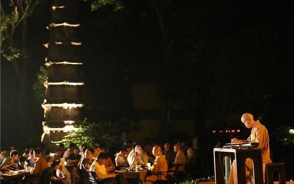 灵隐寺中秋拜月仪式 灵隐寺方丈光泉大和尚参加活动 杭州佛学院法师带来梵呗《五方佛》表演 9月27日,农历八月十五,是月圆人圆万众团圆的中秋节,在佛教中则是月光菩萨的圣诞。古刹灵隐梵呗悠扬,在庄严大雄宝殿前,灵隐寺四众弟子举行庄严的拜月仪式,共同祈愿世界安定祥和,祖国繁荣昌盛,人民幸福安乐,万类有情恒吉祥。 佛学院法师们带来的功夫表演 精彩的表演吸引了与会大众 佛学问答环节法师提问居士回答现场气氛热烈 气势雄宏的大合唱 萧独奏《寒山僧踪》 夜晚的灵隐古刹庄严殊胜,皓月当空洒下漫天柔柔的光辉。灵隐寺常住法师、杭州佛学院师生以及灵隐寺居士,为大家精心供奉了丰富多彩的节目表演,一