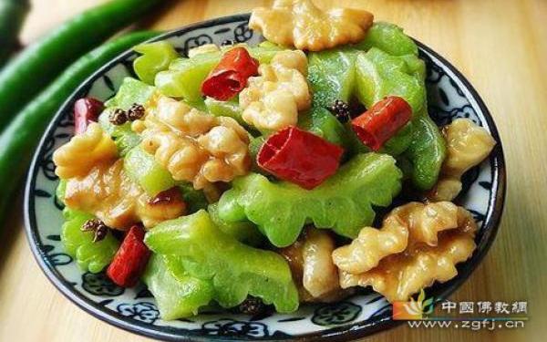 【主料】:苦瓜150g、核桃(鲜)40g 【辅料】:调和油适量、盐适量、花椒适量、蘑菇精适量、辣椒适量 核桃香煸苦瓜的做法: 步骤1、核桃用热水泡发五分钟后剥去外皮。 步骤2、苦瓜对半切开再切成稍厚的小片。 步骤3、准备二十粒花椒,辣椒三个切小段。 步骤4、炒锅上火,倒入食用油,小火慢慢煸香核桃后捞出备用。 步骤5、把花椒、辣椒放入底油中煸香。 步骤6、放入苦瓜煸炒。 步骤7、调入适量盐和少许蘑菇精煸炒均匀。 步骤8、放入炒香的核桃翻炒均匀即可出锅。 烹饪技巧: 苦瓜煸炒时间不可太长,以免绵软口感不好。