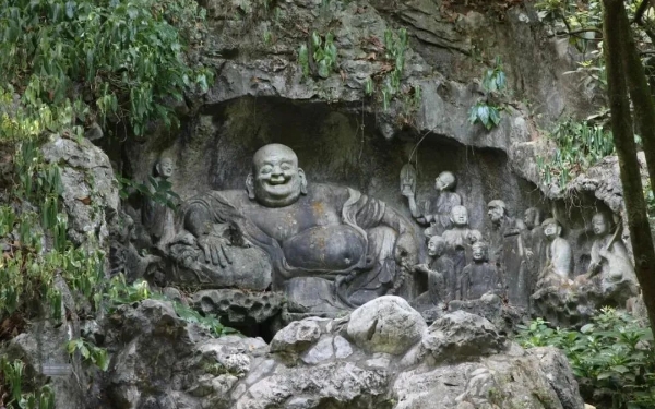 三月初三 布袋和尚坐化纪念日只个心心心是佛,十方世界最灵物。纵横妙用可怜生,一切不如心真实。腾腾自在无所为,闲闲究竟出家儿。若睹目前真大道,不见纤毫也大奇。万法何殊心何异,何劳更用寻经义。心王本自绝多知,智者只明无学地。非圣非凡复若乎,不疆分别圣情孤。无价心珠本圆净,凡是异相妄空呼。人能弘道道分明,无量清高称道情。携锡若登故国路,莫愁诸处不闻声。——布袋和尚布袋和尚是五代后梁时期应现于明州奉化的一位高僧,因常背负一只布袋,又称布袋和尚,因为被后世视为弥勒菩萨化身,他的故事在民间广为流传。唐末的一天清晨,奉化长汀村前的江中水声大作,波涛轰鸣。正在田间劳作的村民张重天见惯了春汛的洪峰浊浪,令他感